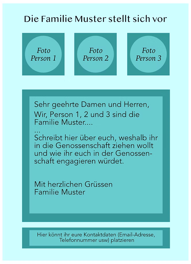 Wir sind sehr engagierte Menschen und würden uns liebend gerne in der Genossenschaft einbringen. Musterina würde gerne im Garten aktiv werden und den anderen Genossenschaftler*innen ihr botanisches Wissen übermitteln. Mustermax würde liebend gerne am Wochenende mit den Kindern der Genossenschaft ein paar Bälle kicken. Kurzum, es wäre einfach wunderbar, Teil der Mustergenossenschaft zu werden.